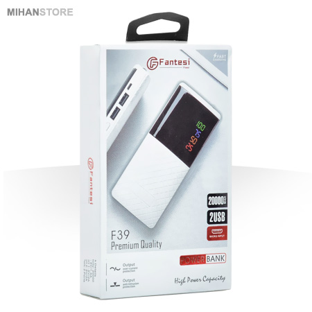 پاوربانک فانتسی 4000 میلی آمپر با ظرفیت اسمی 20000 میلیآمپرساعت محصول برند «Fantesi» است. این محصول با دو درگاه خروجی امکان شارژ همزمان دستگاههایتان را به شما میدهد. باتری این شارژر از نوع لیتیومی است و ولتاژ ورودی و خروجی این شارژر همراه 5 ولت است. بنابراین اگر دستگاههای 5 ولتی مانند گوشی، تبلت یا دوربین دیجیتال یا پخشکننده همراه دچار مشکل کمبود شارژ شد و به برق شهری یا خودرو دسترسی نداشتید، این پاور بانک مشکل شما را حل میکند. از روی نمایشگر دقیق درصد، میتوان میزان شارژ باقیمانده را فهمید و یک چراغ LED بزرگ روی آن وجود دارد. این چراغ هم مانند چراغقوه عمل میکند هم میتواند حالت چشمک زن داشته باشد. بدنهی آن از پلی کربنات و پلاستیک ABS ساختهشده است و جای خط و خش بهآسانی روی آن نمیافتد.