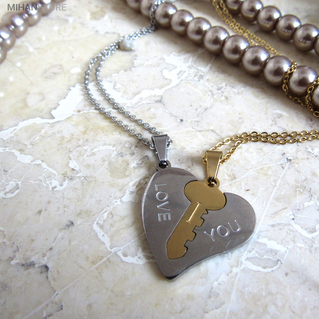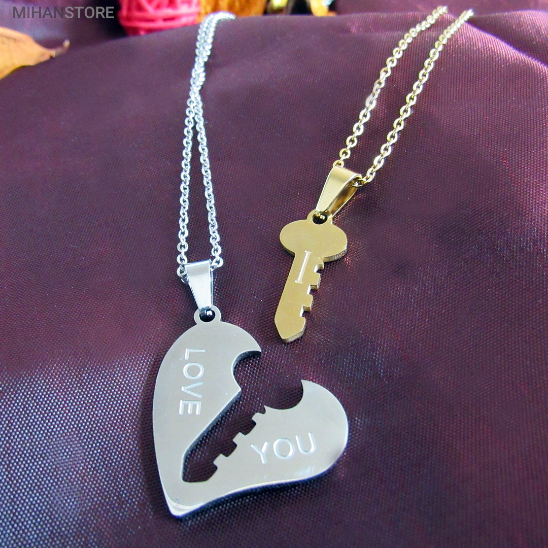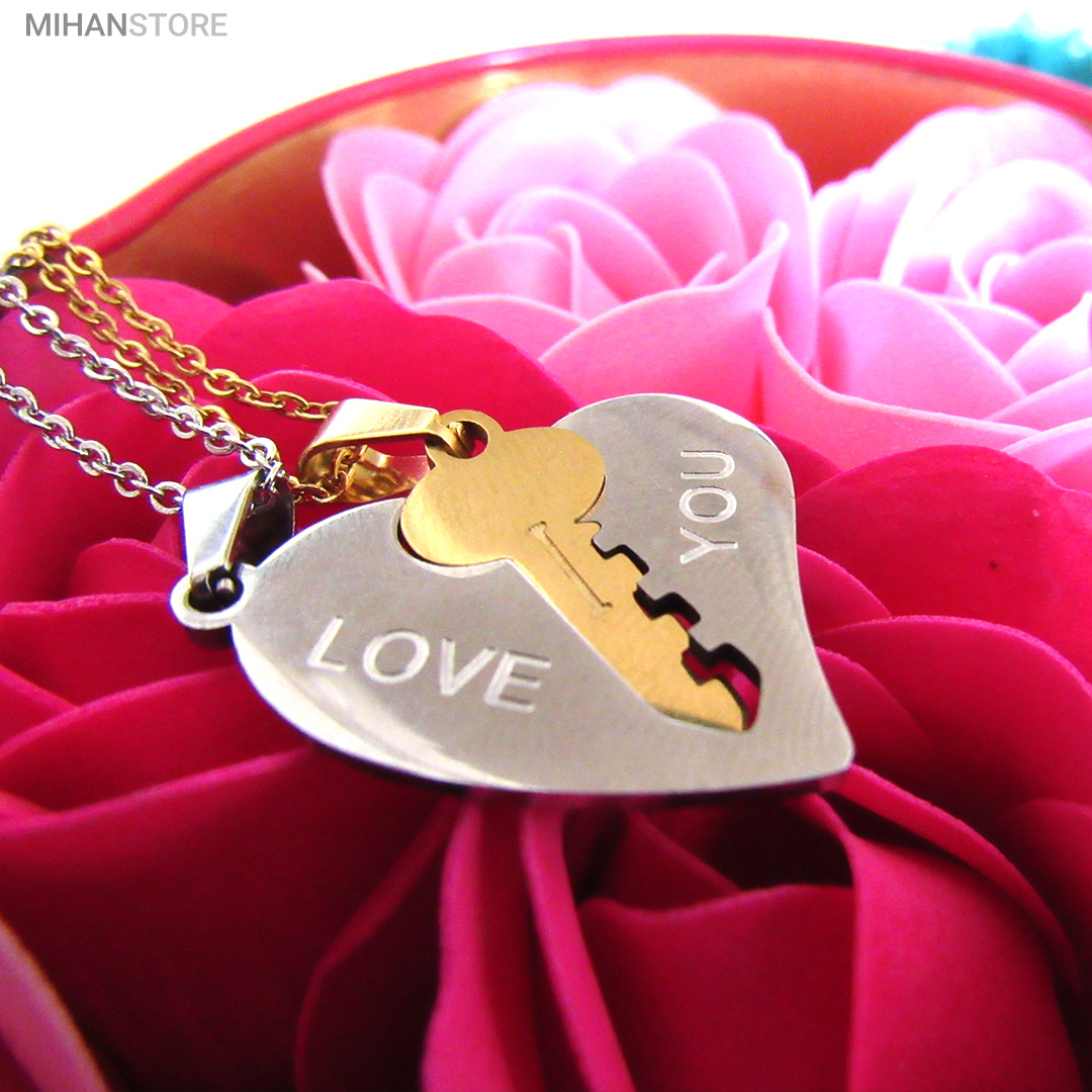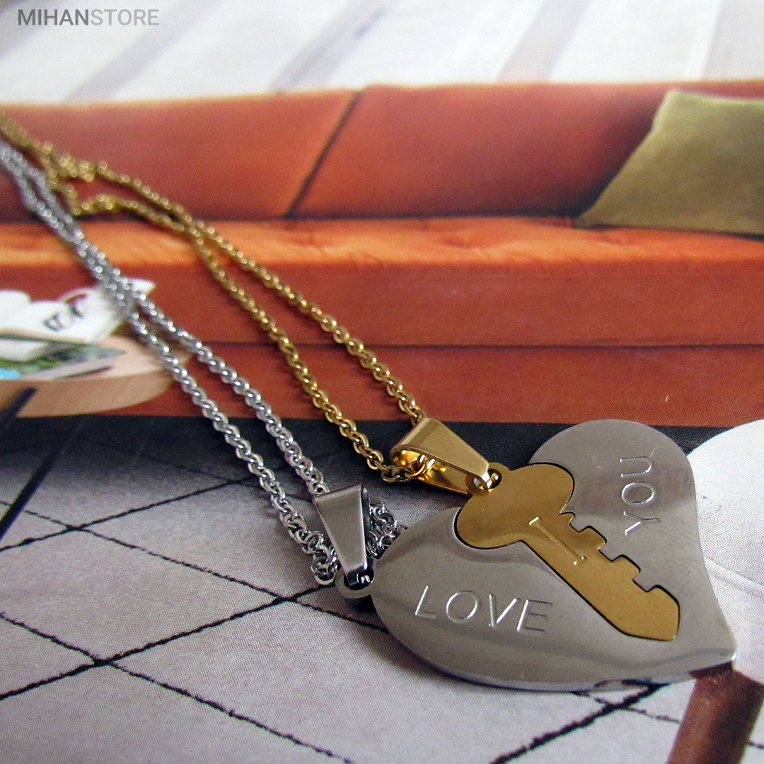 گردنبند دو تکه قلب و کلید استیل رنگ ثابت و ضد حساسیت که از یک پلاک قلب نقره ای و یک پلاک کلید طلایی تشکیل شده است و می تواند هدیه ای زیبا برای روز تولد و روز ولینتاین و… باشد. این مجموعه گردنبند زنانه و مردانه از جنس استیل Stainless Steel بوده و کلمه ی I LOVE YOY به معنای "دوستت دارم" با زیبایی و ظرافت بر روی آن ها حک شده است. این زیور به دلیل ابعاد ظریف و طراحی ساده و زیبایی که دارد براحتی مورد قبول سلیقه های خاص قرار میگیرد. گردنبند زنانه ی این مجموعه قلبی شکل کوچک با ابعاد 30 میلی متر است که قلب به رنگ نقره ای و کلید به رنگ طلایی است. طول زنجیر این آویز 44 سانتی متر است. استفاده از مواد اولیه ی با کیفیت، ظرافت در طراحی و همچنین استفاده از واژه ی "دوستت دارم" این مجموعه را به انتخاب مناسبی برای عشاقی که می خواهند یادگاری ای برای عشق جاودانه ی خود داشته باشند، تبدیل کرده است. همچنین زیبایی و خاص بودن این محصول یک هدیه ی مناسب و جالب برای سالگرد ازدواج و یا هر مناسبت مشابه دیگر میباشد.
