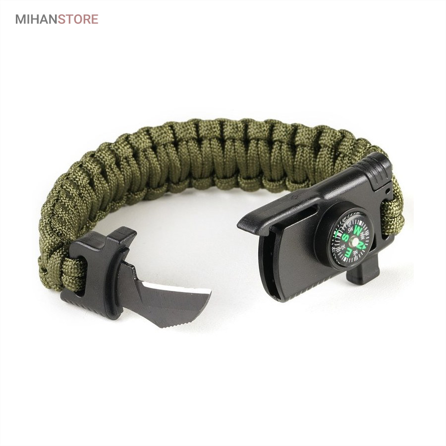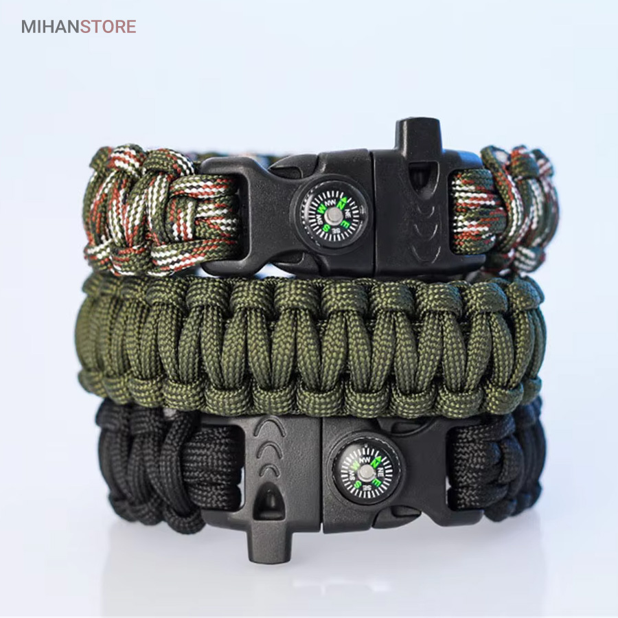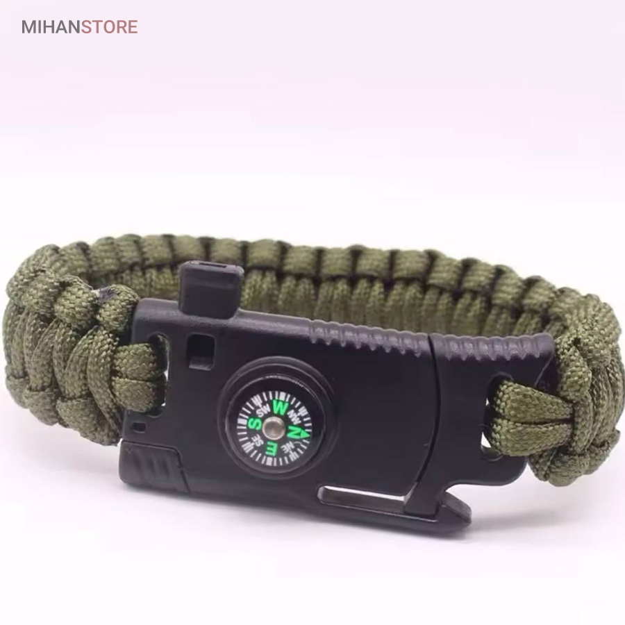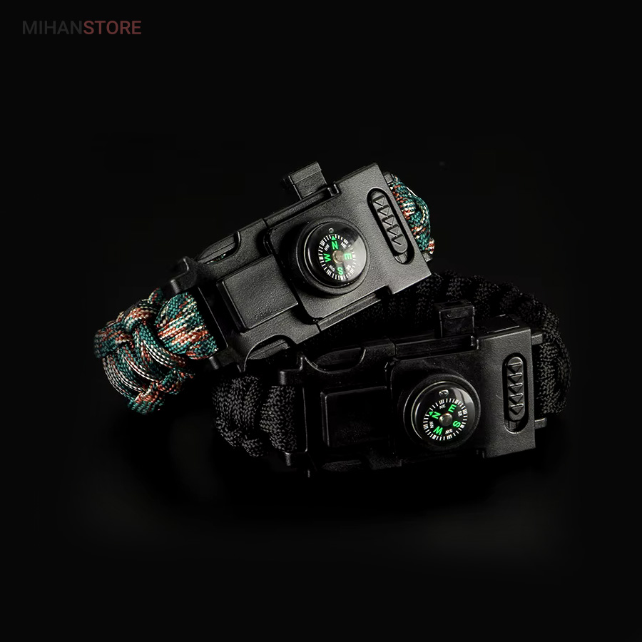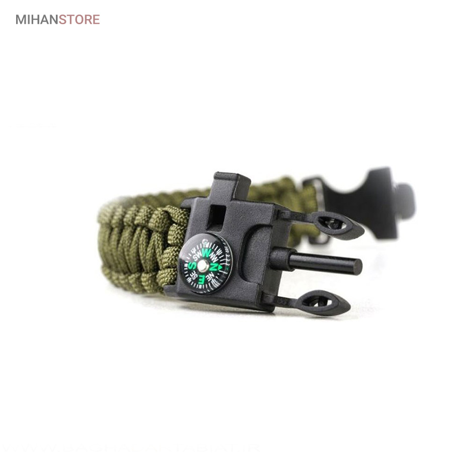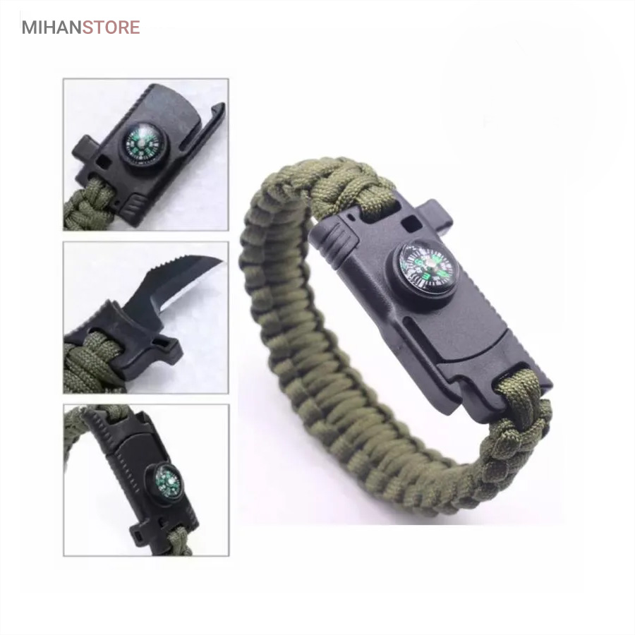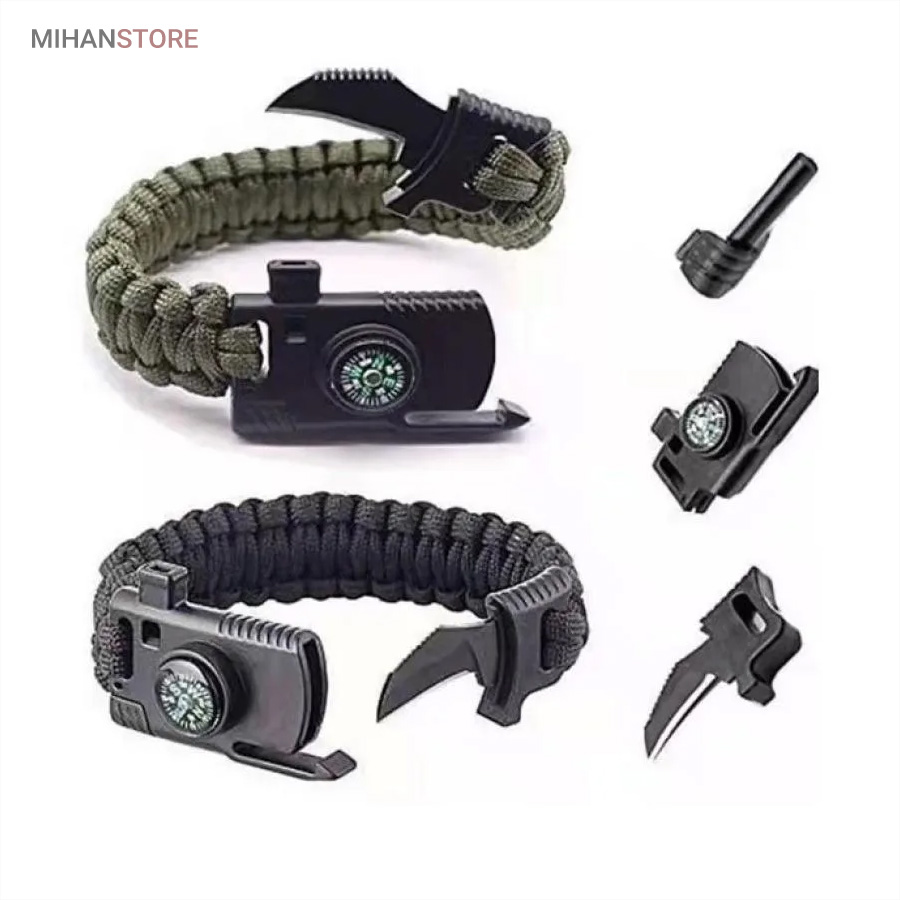 دستبند پاراکورد و نجات دارای وسایل ضروری برای بقا در طبیعت است، به وسیلۀ این دستبند میتوانید به راحتی آتش روشن کنید، از ارتفاع پایین بیایید، مسیریابی کنید، ماهیگیری انجام دهید و… اگر به شکل دستبند پاراکورد و نجات نگاه کرده باشید متوجه میشوید که مانند یک طناب است، جالب است بدانید که طناب پاراکورد ساخته شده برای چتربازی هم مورد استفاده قرار میگیرد و از مقاومت و استحکام بسیار بالایی برخوردار است. مقاومت بالای این طناب به میزانی است که میتوانید یک وزنهی 200 کیلوگرمی را بدون نگرانی به آن متصل کنید، از طناب پاراکورد علاوه بر چتربازی میتوان در ماهیگیری، بند آوردن خونریزی، درست کردن آتش، فرود آمدن از ارتفاع، طناب نگهدارندهی چادر، درست کردن پناهگاه و… نیز استفاده کرد.دستبند پاراکورد و نجات معمولا از 7 تا 9 رشته طناب با طولی 3 تا 4 متری تشکیل شده است که میتوان برای مصارف مختلف در سفر از آن استفاده کرد. دارای ضروریات مربوط به یک سفر بوده و همچنین میتواند به دلیل زیبایی آن نیز مورد استفاده قرار گیرد، این وسیلۀ کاربردی میتواند کادوی بسیار مناسبی برای افرادی باشد که بسیار در طبیعت سفر میکنند. قطب نما، سوت اضطراری این سوت سطح سر و صدا را میتواند تا 110 db ایجاد کند و به امدادگران سیگنال دهد و چاقو که برای برش طناب و مواقع ضروری مورد استفاده قرار میگیرد و پشت چاقو در قسمت بالا هم دندانههایی قرار دارد.