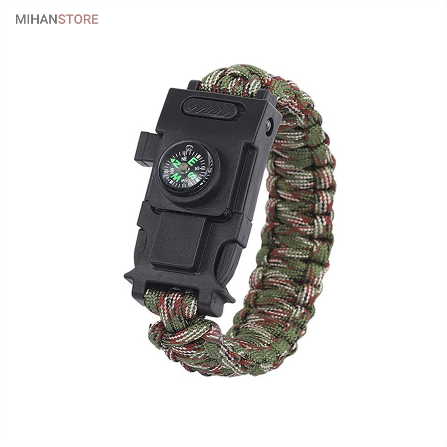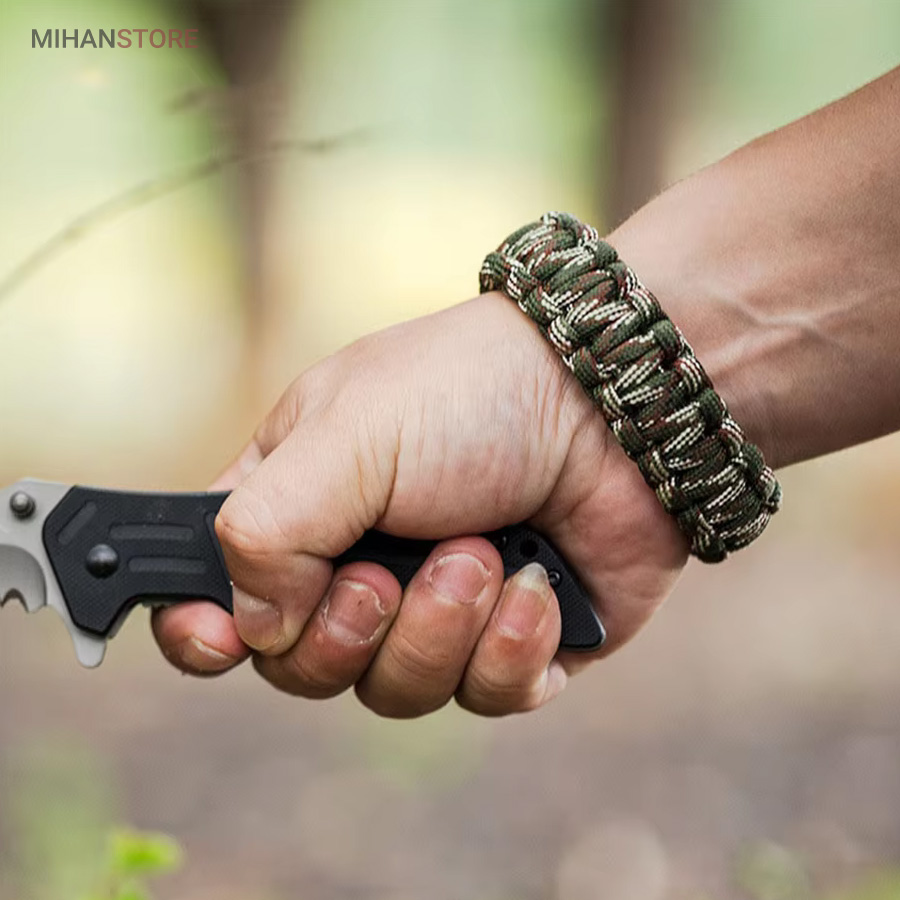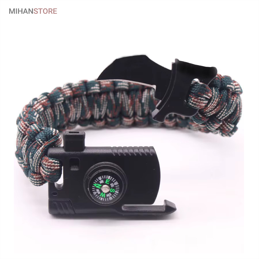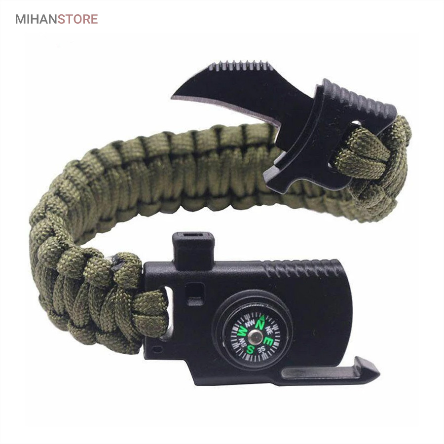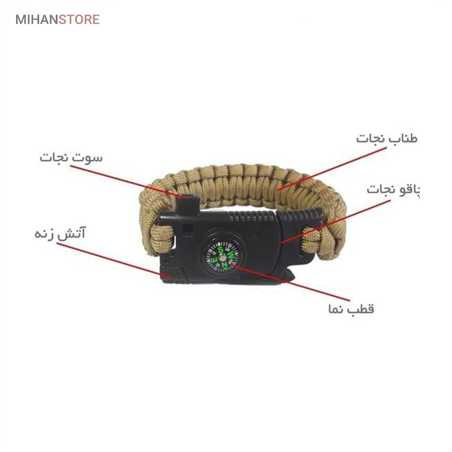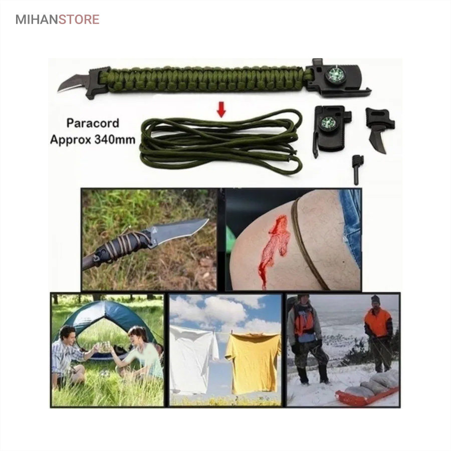 دستبند پاراکورد و نجات دارای وسایل ضروری برای بقا در طبیعت است، به وسیلۀ این دستبند میتوانید به راحتی آتش روشن کنید، از ارتفاع پایین بیایید، مسیریابی کنید، ماهیگیری انجام دهید و… اگر به شکل دستبند پاراکورد و نجات نگاه کرده باشید متوجه میشوید که مانند یک طناب است، جالب است بدانید که طناب پاراکورد ساخته شده برای چتربازی هم مورد استفاده قرار میگیرد و از مقاومت و استحکام بسیار بالایی برخوردار است. مقاومت بالای این طناب به میزانی است که میتوانید یک وزنهی 200 کیلوگرمی را بدون نگرانی به آن متصل کنید، از طناب پاراکورد علاوه بر چتربازی میتوان در ماهیگیری، بند آوردن خونریزی، درست کردن آتش، فرود آمدن از ارتفاع، طناب نگهدارندهی چادر، درست کردن پناهگاه و… نیز استفاده کرد.دستبند پاراکورد و نجات معمولا از 7 تا 9 رشته طناب با طولی 3 تا 4 متری تشکیل شده است که میتوان برای مصارف مختلف در سفر از آن استفاده کرد. دارای ضروریات مربوط به یک سفر بوده و همچنین میتواند به دلیل زیبایی آن نیز مورد استفاده قرار گیرد، این وسیلۀ کاربردی میتواند کادوی بسیار مناسبی برای افرادی باشد که بسیار در طبیعت سفر میکنند. قطب نما، سوت اضطراری این سوت سطح سر و صدا را میتواند تا 110 db ایجاد کند و به امدادگران سیگنال دهد و چاقو که برای برش طناب و مواقع ضروری مورد استفاده قرار میگیرد و پشت چاقو در قسمت بالا هم دندانههایی قرار دارد.