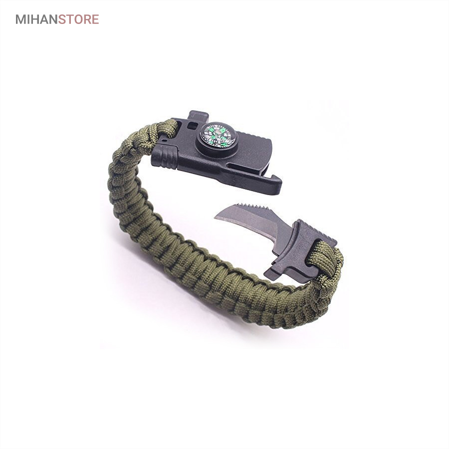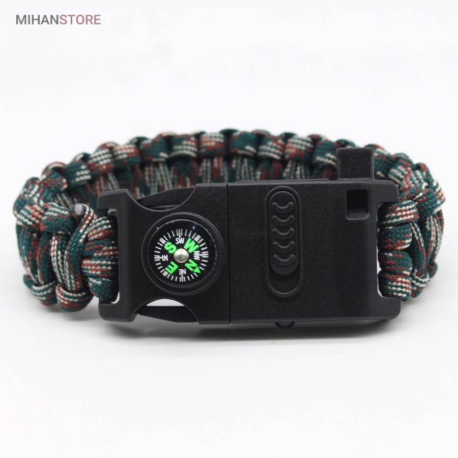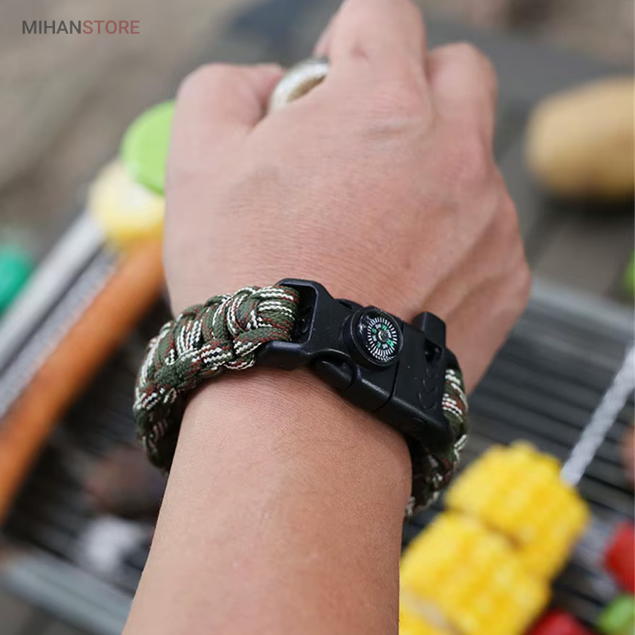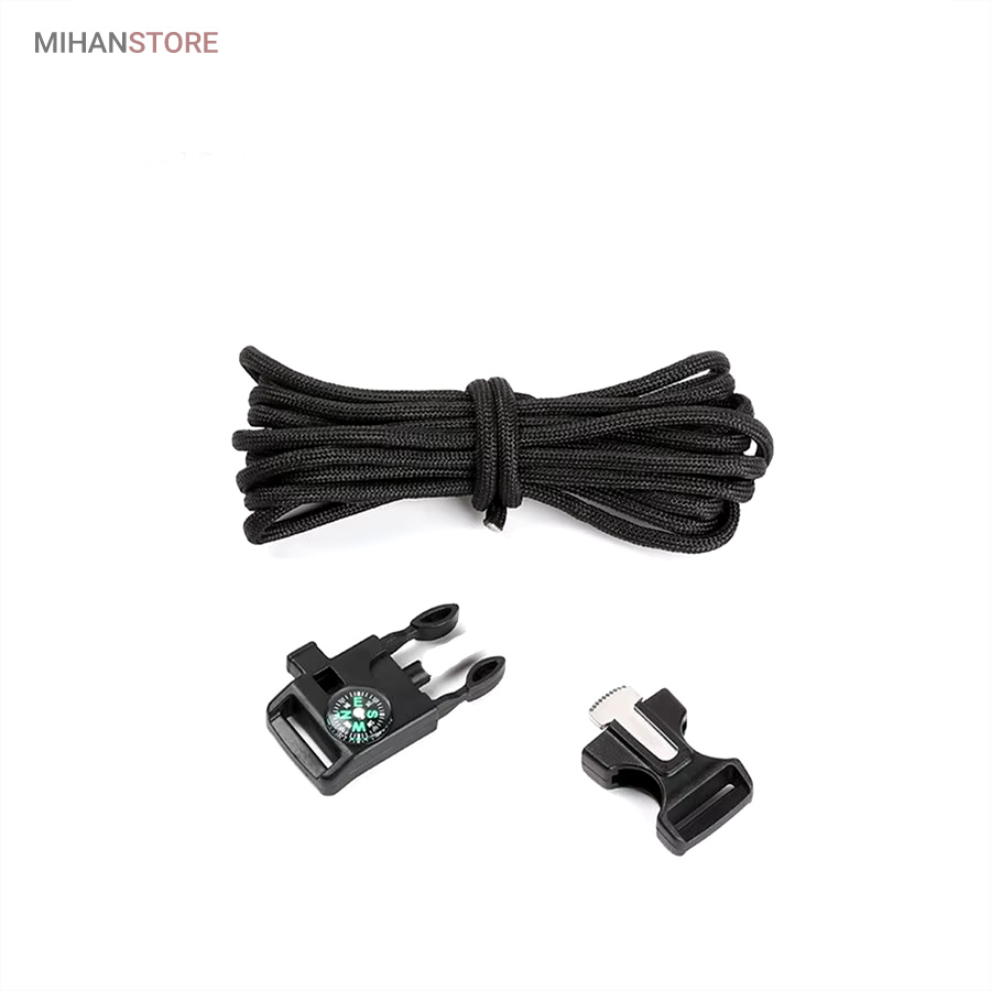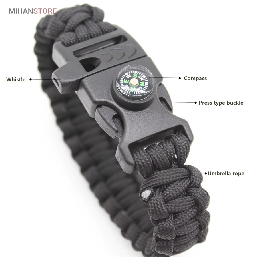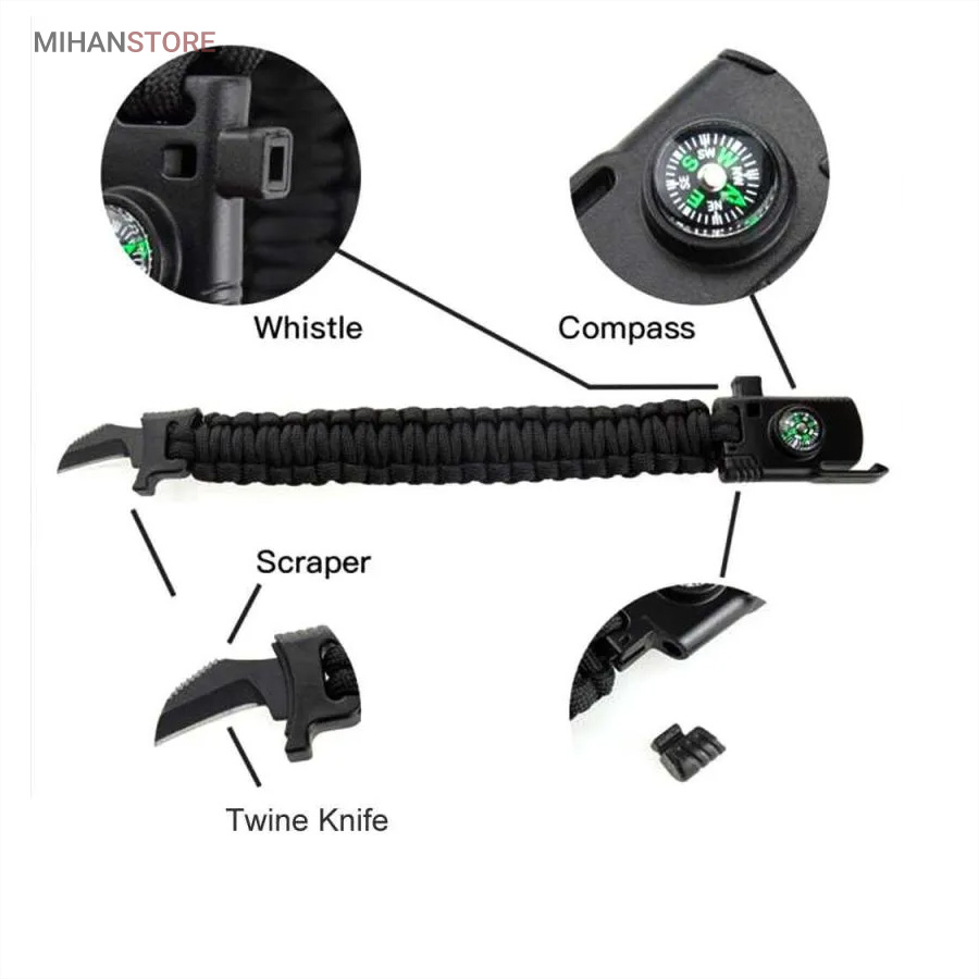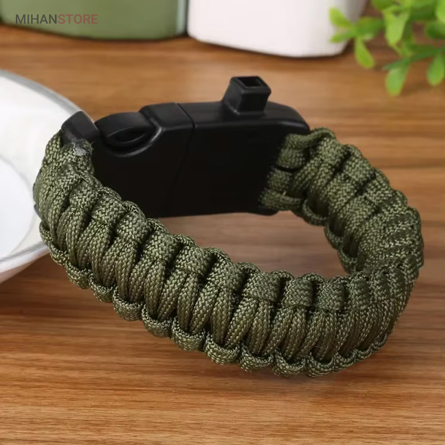 دستبند پاراکورد و نجات دارای وسایل ضروری برای بقا در طبیعت است، به وسیلۀ این دستبند میتوانید به راحتی آتش روشن کنید، از ارتفاع پایین بیایید، مسیریابی کنید، ماهیگیری انجام دهید و… اگر به شکل دستبند پاراکورد و نجات نگاه کرده باشید متوجه میشوید که مانند یک طناب است، جالب است بدانید که طناب پاراکورد ساخته شده برای چتربازی هم مورد استفاده قرار میگیرد و از مقاومت و استحکام بسیار بالایی برخوردار است. مقاومت بالای این طناب به میزانی است که میتوانید یک وزنهی 200 کیلوگرمی را بدون نگرانی به آن متصل کنید، از طناب پاراکورد علاوه بر چتربازی میتوان در ماهیگیری، بند آوردن خونریزی، درست کردن آتش، فرود آمدن از ارتفاع، طناب نگهدارندهی چادر، درست کردن پناهگاه و… نیز استفاده کرد.دستبند پاراکورد و نجات معمولا از 7 تا 9 رشته طناب با طولی 3 تا 4 متری تشکیل شده است که میتوان برای مصارف مختلف در سفر از آن استفاده کرد. دارای ضروریات مربوط به یک سفر بوده و همچنین میتواند به دلیل زیبایی آن نیز مورد استفاده قرار گیرد، این وسیلۀ کاربردی میتواند کادوی بسیار مناسبی برای افرادی باشد که بسیار در طبیعت سفر میکنند. قطب نما، سوت اضطراری این سوت سطح سر و صدا را میتواند تا 110 db ایجاد کند و به امدادگران سیگنال دهد و چاقو که برای برش طناب و مواقع ضروری مورد استفاده قرار میگیرد و پشت چاقو در قسمت بالا هم دندانههایی قرار دارد.