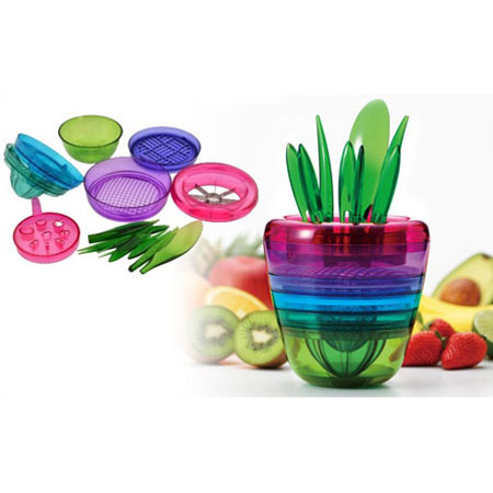 گلدان جادویی Fruits Plant یک محصول بسیار کابردی است که دارای طراحی عالی و هوشمندانه ای می باشد. این محصول 10 کابرد مختلف دارد که از کاربرد های آن می توان به: آبگیر لیمو، قاچ کن سیب، صفحه برش توری، رنده توری شکل، آبگیر گریپ‌فروت و ... اشاره کرد. جالب است بدانید برگ های این گلدان هم کاربرد های مختلف دارد! 2 برگ برای برش لیمو و 4 برگ کوچک بعنوان چنگال طراحی شده اند. این گلدان هم یک دکوری فانتزی و شیک برای آشپزخانه شما می باشد و هم یک وسیله 10 کاره بسیار کاربردی!